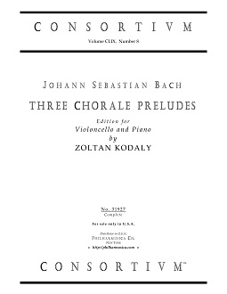 Bach, J.S. THREE CHORALE PRELUDES Vlc/pf 31927 Kodaly, Zoltan Complete ($11.50) Johann Sebastian Bach THREE CHORALE PRELUDES, edition for Violoncello and Piano by Zoltan Kodaly (1882-1967). The print is cleaned and graphically enhanced, produced and printed in U.S.A. 31927 |