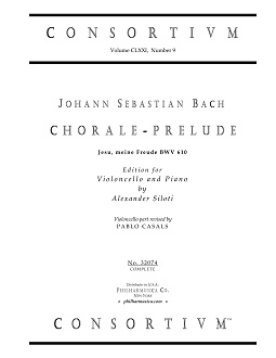 Bach, J.S. CHORALE - PRELUDE BWV 610 Vlc/pf 32074 Siloti-Casals Complete ($11.50) Jesu, meine Freude BWV 610 in edition for violoncello and piano by Alexander Siloti (1863-1945). Violoncello part revised by Pablo Casals. 32074 |