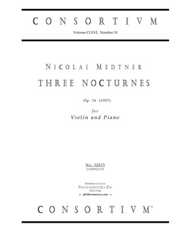 Medtner, Nicolai THREE NOCTURNES, op. 16 (1907) Vln/pf 32015 Complete ($17.50) NICOLAI MEDTNER (1880-1951) A cleaned and graphically enhanced print of the Leipzig-engraved publication. Produced and printed in U.S.A. There are performances of this work on YouTube, commercial CD, digital media. 32015 |