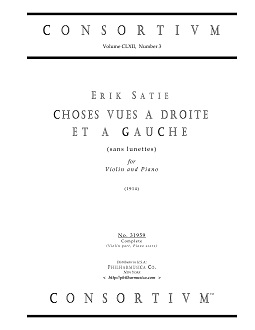 Satie, Erik CHOSES VUES A DROITE ET A GAUCHE (1914) Vln/pf 31959 Complete ($9.50) ERIK SATIE (1866-1925) Choses vues à droite et à gauche (sans lunettes) from the year 1914. Cleaned and graphically enhanced print of the original publication, unedited --- as intended by the composer. 31959 |
