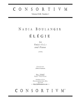 Boulanger, Nadia ÉLÉGIE (1906) for Voice and Piano (Fr) Voice (t.c.)/pf 31847 Piano/vocal score ($9.50) French text by Albert Samain (1858-1900). Newly produced print, cleaned and graphically enhanced. Price is for one (1) Piano/vocal score. Produced and printed in U.S.A. 31847 |