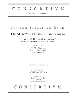 Bach, J.S. Final Mvt., Christmas Oratorio BWV 248 SATB/tpts(3)/org 31772 Boswell, W&J Org/full sc+tpt pts ($22.50) "Nun seid ihr wohl gerochen" (Now Vengeance Hath Been Taken), edition for SATB Chorus, Three Trumpets and Organ. German and English texts. Organ/Full score along with trumpet parts in D. One copy of the Choral Part is included; additional Choral Parts are available. There is an MP3 sound file on the Philharmusica main web page. 31772 |