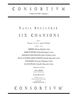 Boulanger, Nadia SIX CHANSONS (1907-22) (Fr) Voice (t.c.)/pf 32036 Piano/vocal score ($17.50) NADIA BOULANGER (1887-1979) The six chansons with French texts include: PRIERE (Henry Bataille) (1909), SOIR D'HIVER (Nadia Boulanger) (1915), SOLEILS COUCHANTS (Paul Verlaine) (1907), ELLE A VENDU MON COEUR (Camille Mauclair) (1922), CHANSON (Georges Delaquys) (1909), LE COUTEAU (Camille Mauclair) (1922). Cleaned and graphically enhanced reprints of the original publications. Produced and printed in U.S.A. For sale only in U.S.A. 32036 |
