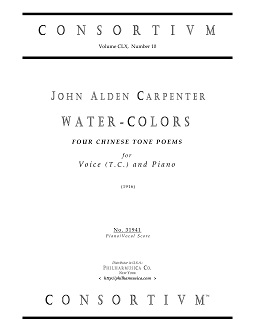 Carpenter, John Alden WATER-COLORS (1916) (E) Voice(t.c.)/pf 31941 Piano/vocal score ($12.50) JOHN ALDEN CARPENTER (1876-1951) WATER-COLORS, Four Chinese Tone Poems (1916). English texts by Herbert A. Giles. Price is for one (1) Piano/Vocal Score. Produced and printed in U.S.A. There are performances of this work on YouTube, commercial CD, digital media. 31941 |