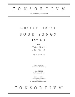 Holst, Gustav FOUR SONGS (XV C.), op. 35 (1916-17) (E) Voice (t.c.)/violin 31906 Perf score ($10.50) A sensitive masterwork for voice (t.c.) and violin from English composer Gustav Holst (1874-1934). The anonymous English texts are from the XV Century and are included in four movements: I - Jesu Sweet; II - My soul has nought but fire and ice; III - I syng of a maiden; IV - My Leman is so true. Duration: ca. 7'30". Price is for one (1) Performance Score. There are performances of this work on YouTube, commercial CD, digital media; including the CD Naxos 8.557117, The English Song Series 6, Susan Gritton, soprano; Louisa Fuller, violin. 31906 |