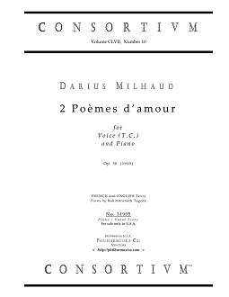 Milhaud, Darius 2 Poèmes d'amour, op. 30 (1915) (F/E) Voice (t.c.)/pf 31905 Piano/vocal score ($10.50) This edition includes both the French AND English texts, with poetry by Rabindranath Tagore. The publication is a cleaned and graphically enhanced print on quality paper and cover. Produced and printed in U.S.A.; for sale only in U.S.A. Price is for one (1) Piano/Vocal Score. There are performances of this work on YouTube, commercial CD, digital media. 31905 |