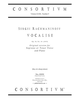Rachmaninoff, Sergei VOCALISE, op. 34/14 (1915) (orig. c# min) Sop or ten voice/pf 32050 Piano/vocal score ($12.50) SERGEI RACHMANINOFF (1873-1943) This reprint edition features the original Gutheil/Moscow publication (with Leipzig engraving). Original key of c-sharp minor, specified for soprano or tenor voice by Rachmaninoff. 32050 |