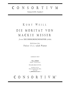 Weill, Kurt Die Moritat von Mackie Messer (1928) (G) Voice (t.c.)/pf 32010 Aud, Jean-Jacques Piano/vocal score ($12.50) KURT WEILL (1900-1950) DIE MORITAT VON MACKIE MESSER (The Ballad of Mack the Knife) from DIE DREIGROSCHENOPER (The Threepenny Opera) (1928) in edition for Voice (T.C.) and Piano (German text). Intended for recital use, this version consists of the complete original German text and follows closely to the original score. The text is by Bertolt Brecht with music by Kurt Weill and is presented much as it was performed in 1928 Berlin. Duration: ca. 3'15". Produced and printed in U.S.A. For sale only in U.S.A. Demo sound file is located on the "Separate Page" of additional MP3 files. 32010 |